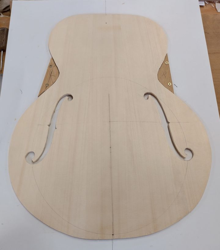 I am currently working on a guitar-bodied archtop octave mandolin. It features a soundboard made with bent staves following the same method as historical viols, and a jointed back made from cherry and sycamore.